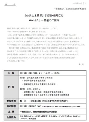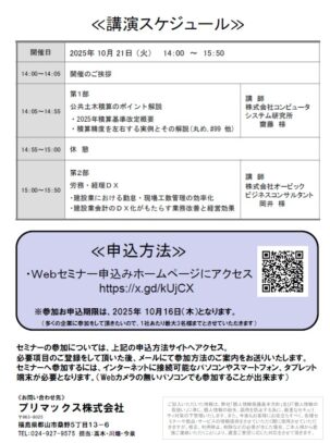 ニュース CATEGORY セミナー 県産連セミナー2025秋 ご案内 2025.10.20 『公共土木積算のポイント解説』 『労務・経理DX』 WEBセミナー開催のご案内 日時:2025年10月21日(火) 14:00~15:50 PriMax > ニュース > セミナー > 県産連セミナー2025秋 ご案内 Tweet Pocket